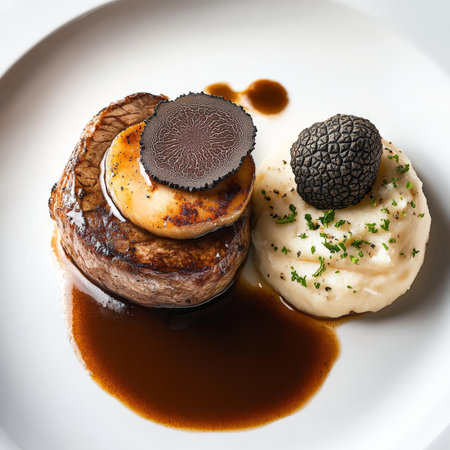 A plate of tournedos Rossini avec sauce Périgueux, a luxurious French dish, featuring a beef tenderloin steak (tournedos), pan-seared to perfection, topped with a slice of pan-fried foie gras and a slice of black truffle, and served with a rich and flavorful Périgueux sauce, made from Madeira wine, beef stock, and chopped black truffles, showing the finest of ingredients, and the culinary mastery of French haute cuisine, arranged artistically on a white plate, and accompanied by a side of truffle mashed potatoes, ready to be enjoyed by the most discerning palates, isolated on a clean white background.
