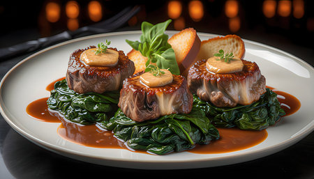 A gourmet dish featuring tender meat pieces bathed in a rich, savory sauce. Ideal for culinary showcases or restaurant menus, this elegant presentation highlights the gourmet appeal of the dish.