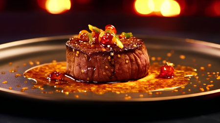 Exquisite close-up of a gourmet steak topped with caramelized peach, served with fresh vegetables and artistic sauce splatter