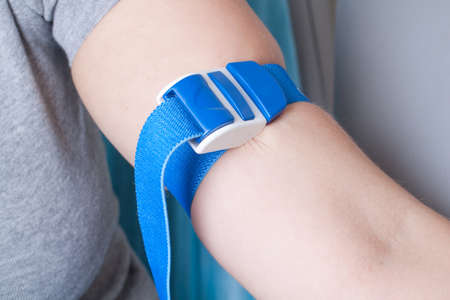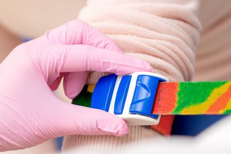 Nurse tightens the harness on the arm to take blood from a vein for analysis.