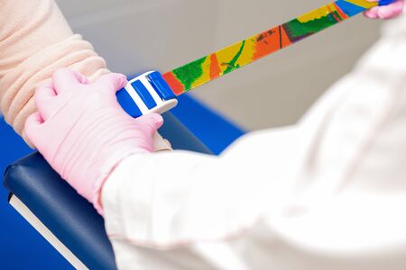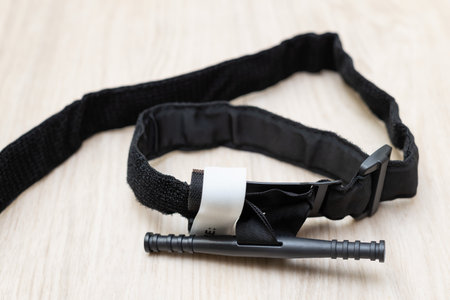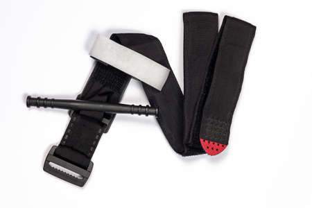Hemostatic tourniquet on a white background top view. A tourniquet to stop bleeding. Bandaging the wounded. Military medicine for the treatment of wounds. Constriction of bleeding