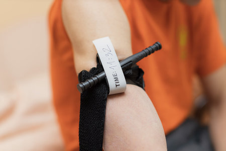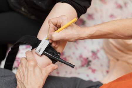 Writing a time on applied tourniquet- caucasian older man.