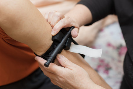 Tightening a tourniquet applied on a arm - caucasian older man.