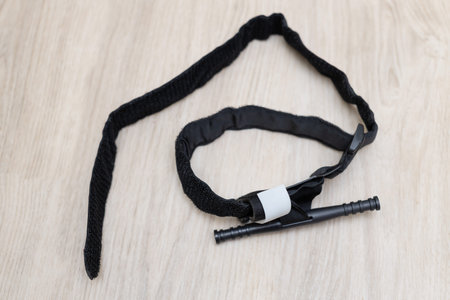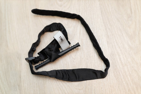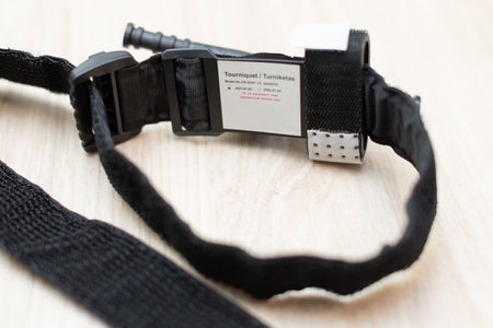 Used opened Tourniquet on a wooden surface.
