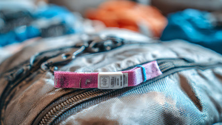 Close-up of a pink wristband on a backpack, used for event access control. Selective focus, shallow depth of field.
