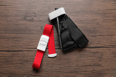 New medical tourniquets on wooden table, flat lay