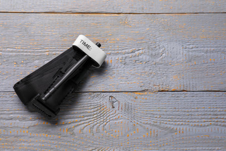 New medical tourniquet on light gray wooden table, top view. Space for text