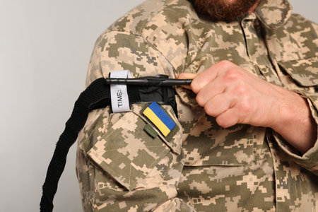 Ukrainian soldier in military uniform applying medical tourniquet on arm against light grey background, closeup