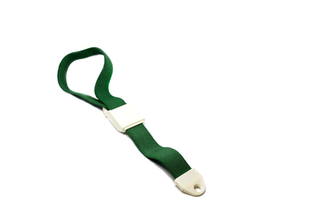 Green tourniquet band on a white background. Tourniquet as a handy tool for constricting blood vessels and veins fir IV medical manipulation