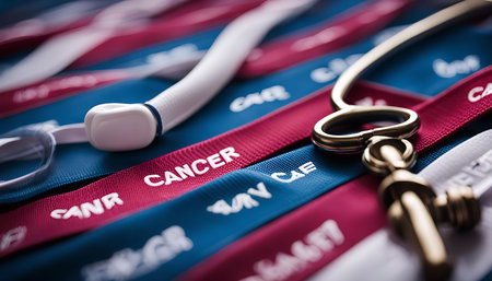 Closeup of cancer awareness ribbons in red, blue, and white with a key and headset lying on top. The ribbons are a symbol of hope and support for cancer patients and survivors.