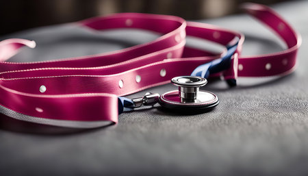 A close-up of a stethoscope and a pink lanyard, symbolizing the medical profession.