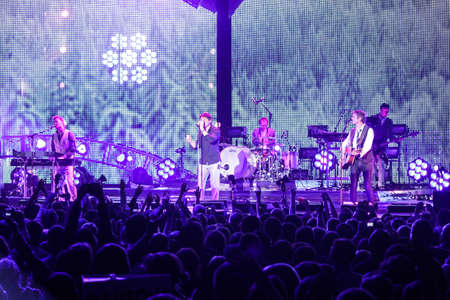 MINSK, BELARUS NOVEMBER 6, 2010 A-ha band Morten Harket, Paul Waaktaar-Savoy, Magne Furuholmen performs during the live concert in Minsk on November 6, 2010