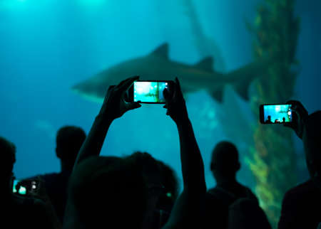 Many people observe shark in the oceanarium.