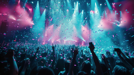 Crowd cheering at a live music concert, lights and confetti