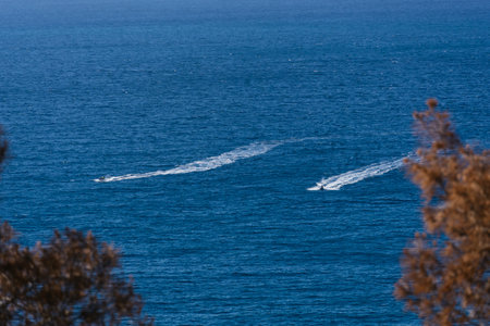 Two speedboats with passengers sail on deep perfectly blue sea in the opposite directions leaving a white trail behind