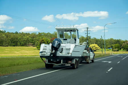 Bruce Highway, Proserpine, Queensland, Australia - December 2021: A motor boat on trailer towed by small truck parked on side of a country road