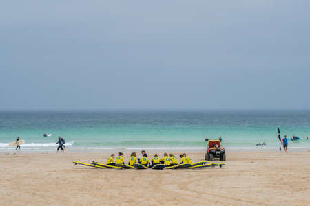 St. Ives, England - May 2018 : Group of surfing adepts sitting on their surfing boards listening to the surfing instructor on the beach, Cornwall, UK