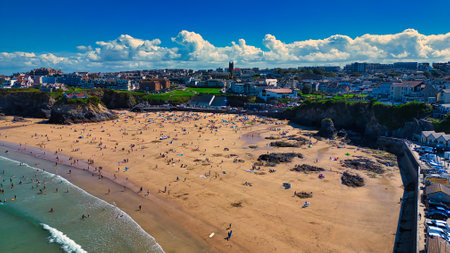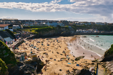 Newquay,Cornwall,England,United Kingdom-June 21st 2021: Many beachgoers visit the popular and large bay,during the school summer holidays,to relax and play in the hot sun.