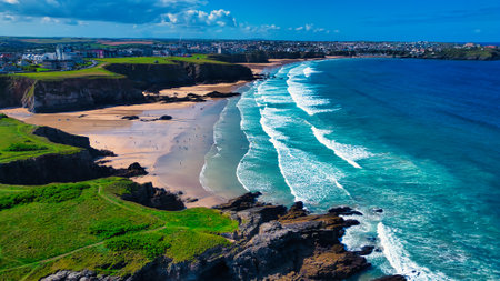 Aerial view of a beautiful beach with golden sand and turquoise waves. Lush green cliffs surround the beach, and a small town is visible in the background under a clear blue sky with scattered clouds.