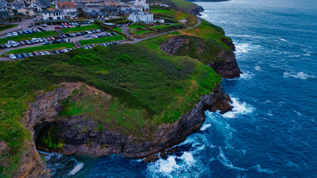Generative AI : Aerial view of Padstow lifeboat station looking towards Mother Ivy Bay Cornwall United Kingdom