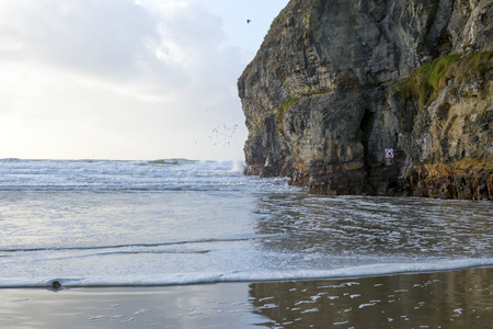 Waves breaking on the beach at high tide on the shore in North Devon UK