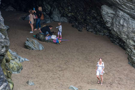 TINTAGEL, CORNWALL/UK - AUGUST 13 : People exploring a cave at Tintagel in Cornwall on August 13, 2013. Unidentified people