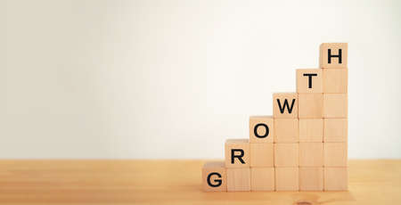 Growth text on wood block step up pattern, with copy space. Business growth concept.