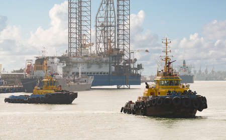 Tug boats awaiting big cargo ship in harbour for tug assistance, maneuvering, mooring operations. Tugboat and tow service concepts.