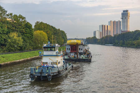 Moscow Region, Russia - September 12, 2021: Twin-screw tugboat Alexander Solodov sails along the canal