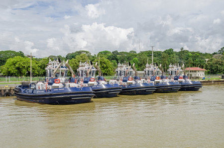 Panama City, Panama - November 4, 2017: Tugboats waiting for order and ready to help ships to transit the Panama Canal.