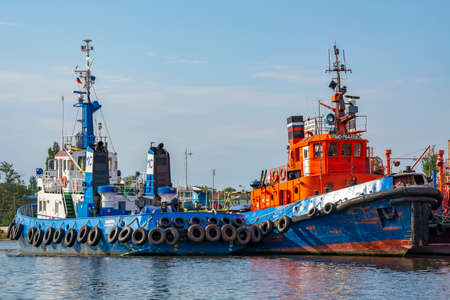 Tugboats at the berth in the Kaliningrad seaport on the Pregolya River, working view