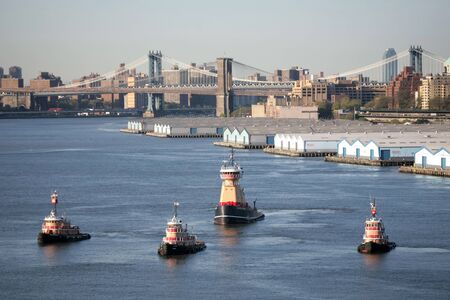 NEW YORK CITY, USA - APRIL 30 : Four Reinauer tugboats sailing in the East River with a view of the Manhattan and Brooklyn Bridge on April 30, 2006 in New York City, USA.