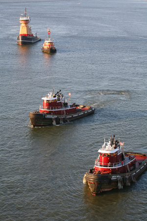 NEW YORK CITY, USA - APRIL 30 : Two Moran tugboats and two Reinauer tugboats sailing in the East River on April 30, 2006 in New York City, USA.