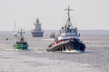 New Bedford, Massachusetts, USA - April 27, 2018: Tug Buckley McAllister and fishing boat Krystle James heading out of New Bedford harbor
