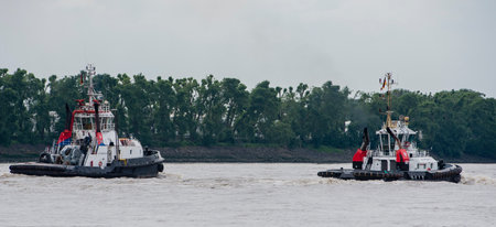 Kronshtadt, Saint Petersburg, Russia - July 20, 2020. Two tugs sail through the harbor of the seaport on a summer day. Horizontal orientation, selective focus