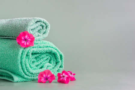 two aquamarine towels lie on a gray-green background along with pink flowers.Rolled face cloths