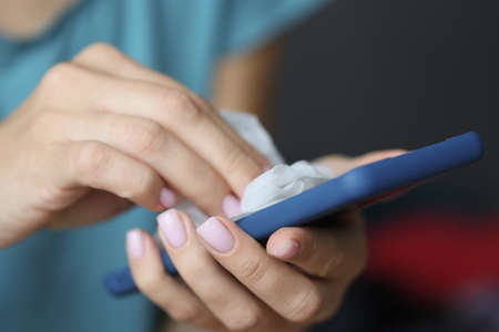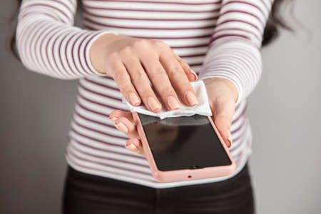 Woman wash cell phone with wet wipes, to prevent illness Novel coronavirus 2019-nCoV after public place. Antiseptic, Hygiene and Healthcare concept