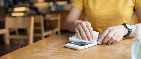 the new normal after covid-19 and concet of sanitizing surfaces, cleaning smartphone with disinfectant wipe to flatten the curve and prevent viruses and bacteria