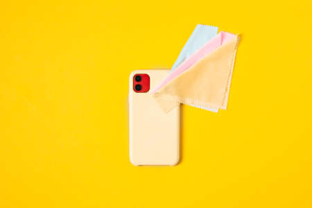 Top view cleaning smart phone screen on yellow background. Flat lay cleaning yellow phone by fabric microfiber concept
