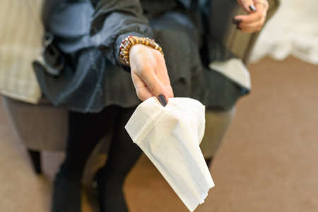 Emotional beautiful young psychologist woman holding a napkin for a client