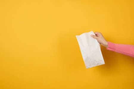 woman holding in hand white blank craft paper bag for takeaway on yellow background. Packaging template mock up. Delivery service concept banner