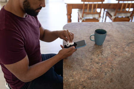 Mixed race man enjoying family time together at home, social distancing and self isolation in quarantine lockdown, cleaning his smartphone with a tissue