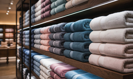 Shelving in the store with neatly folded towels on the shelves and accessories in natural colors