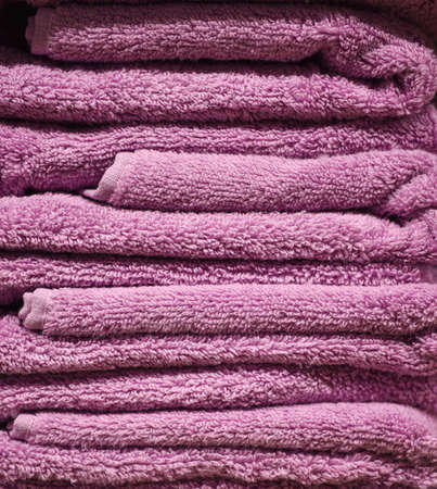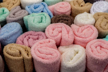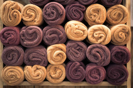 Colorful purple violet beige rolled up towels for Barbershop, Spa Bath Swimming pool, sea Beach, gym fitness in resort hotel concept. Fabric texture cloth background