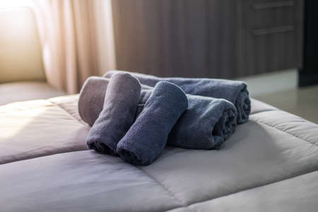Gray terry towels on the bed with white linens. Towels day. Copy space.