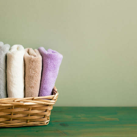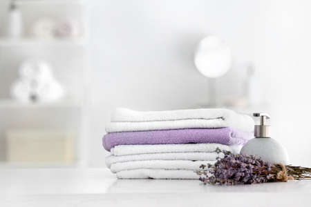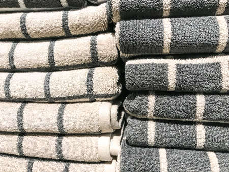 Bath fresh towels pile soft textile cotton body care neatly folded white gray laundry flower shelf