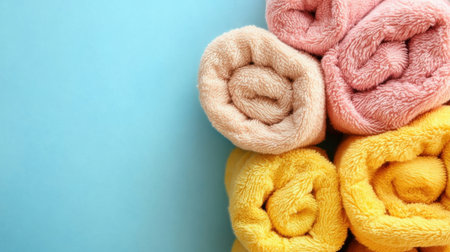 A visually appealing arrangement of rolled towels in vibrant pastel colors against a soft blue background, perfect for creating a cozy and relaxing atmosphere in any setting.