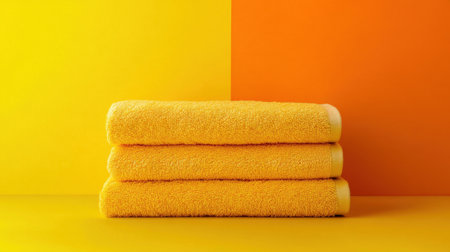 A stack of bright yellow towels arranged against a vibrant yellow and orange background. Ideal for themes of cleanliness, comfort, and cheerful decor.