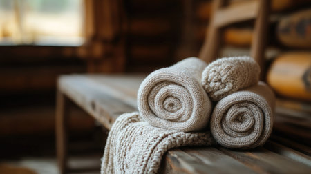 Soft wool socks rolled up neatly on a cozy wooden bench in a rustic home setting.