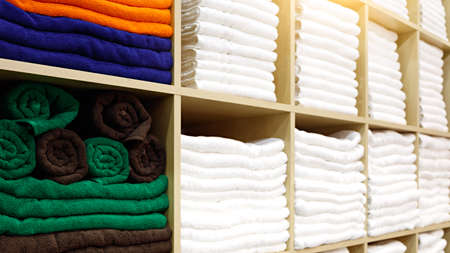 Fresh White and colorful Hotel Towels Folded and Stacked on a Shelf